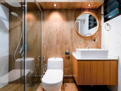 Wood-look tiles give small bathrooms a cosy feel without the upkeep of real wood. Choose light or medium tones to make the space feel brighter. Put them on the floors or walls to add warmth. Add modern fixtures and accessories for a cool, rustic vibe.