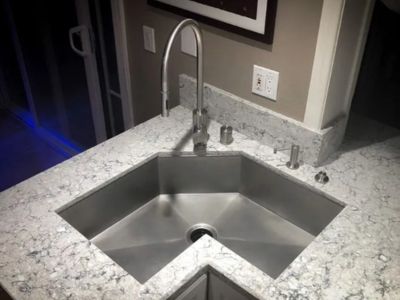 Hoekspoelbakken zijn een creatieve oplossing voor keukens met beperkte aanrechtruimte. Dit zijn driehoekig van vorm en ontworpen als aanvulling op de nauwsluitende hoekkast. Hoewel hoekspoelbakken kleinere wastafels kunnen hebben dan standaard spoelbakken, maximaliseren ze het gebruik van anders verspilde hoekruimte.